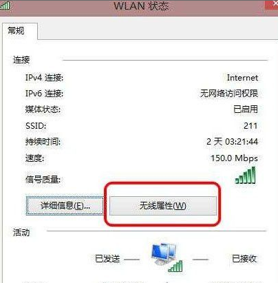 3、在打开的WLAN状态界面,选择无线属性进入。