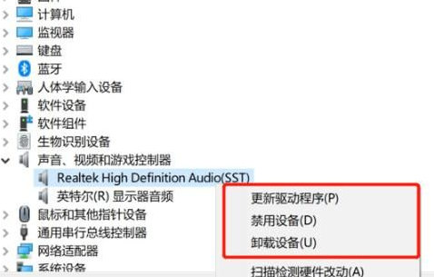 3、右键点击声卡驱动,然后你可以选择“更新驱动”或者“卸载驱动”。