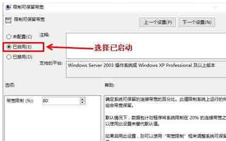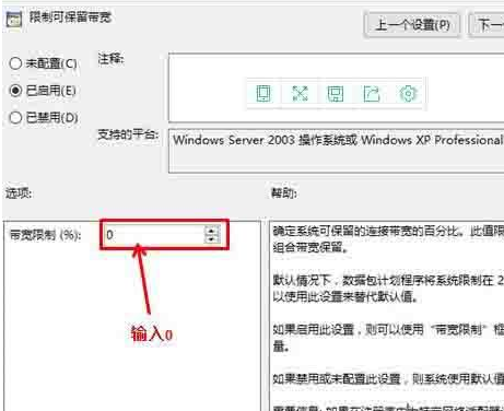 3、双击右侧“限制可保留宽带”弹出对话框,可以看到默认设置为未配置,下面的说明显示:如果禁用或未配置此设置,则系统使用默认值为20% 的连接带宽,因此电脑是被限制了20%的宽带。