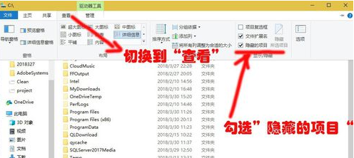 2、然后将菜单切换到查看,将隐藏的项目选项进行勾选。