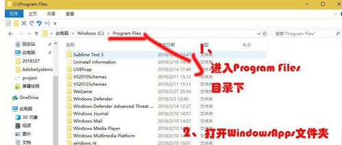 3、然后找到【Program Files】打开,在找到【WindowsApps】文件夹打开。