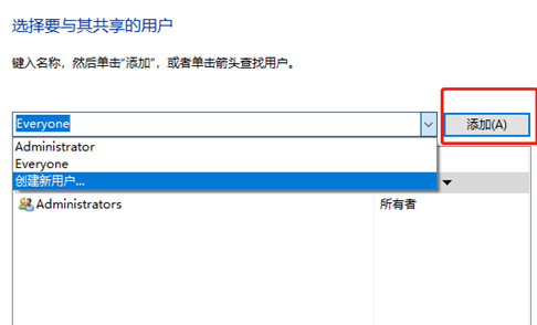 2.然后会出现一个文件共享的界面,在这了选择创建新用户,然后选择添加,然后选择共享。