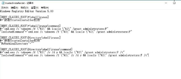 2、将文件重命名为trustedinstaller.txt,将以下代码复制粘贴到记事本里;