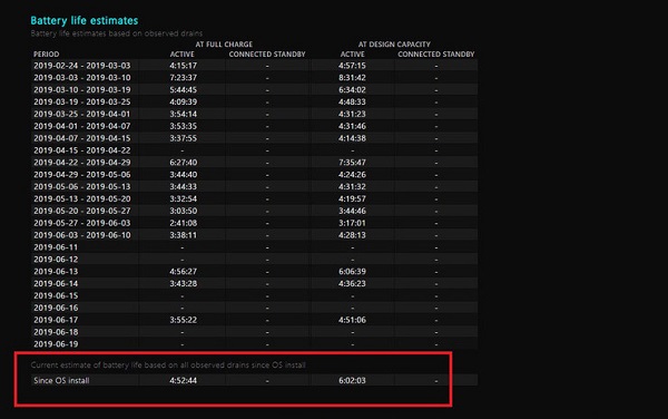 这导致我们进入电池寿命估算部分。 在右边,您将看到它应该基于设计容量持续多长时间; 在左边,你会看到它实际持续多久。 目前的最终电池寿命估算将在报告的最底部。