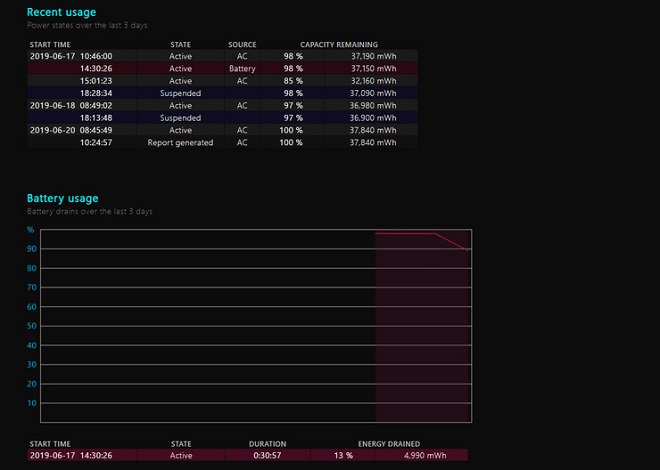在最近的使用部分中,请注意每次笔记本电脑使用电池供电或连接到交流电源时。 在电池使用部分中跟踪过去三天的每次排水。 您还可以在使用历史记录部分下获取电池使用情况的完整历史记录。