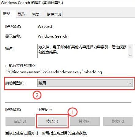 3、然后在打开的窗口点击最下面的停止栏目,然后在启动类型进行修改,设置成禁用模式即可,然后对于设置进行保存,这样就解决看索引关闭的问题。