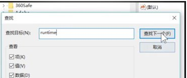 3、在查找窗口编辑框输入“runtime”,勾选“全字匹配”,点击“查找下一个”;