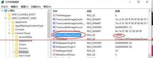 7、鼠标左键双击WaitToKillAppTimeout文件,我的数值数据默认为10000,将其改为0,保存修改后退出即可。
