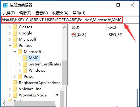 这时候打开注册表编辑器,再展开到以下路径:计算机\HKEY_CURRENT_USER\Software\Policies\Microsoft就可以看到有MMC这个项了。