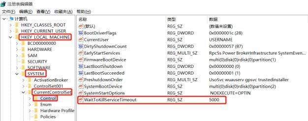 HKEY_LOCAL_MACHINESYSTEMCurrentControlSetControl,并找到右侧的WaitToKillServiceTimeout