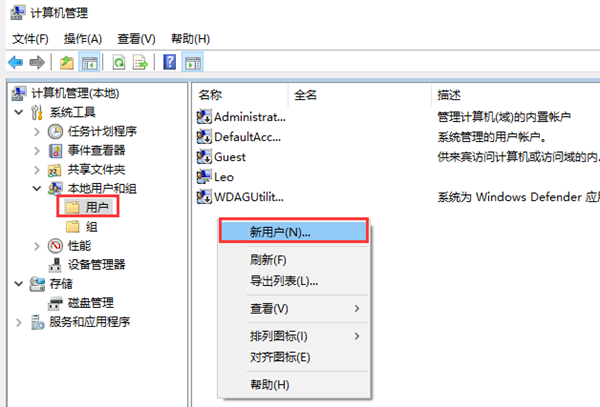 2、计算机管理窗口中,点击左侧【系统工具 - 本地用户和组 - 用户】,然后在右侧空白处,点击【右键】,在打开的菜单项中,选择【新用户】。