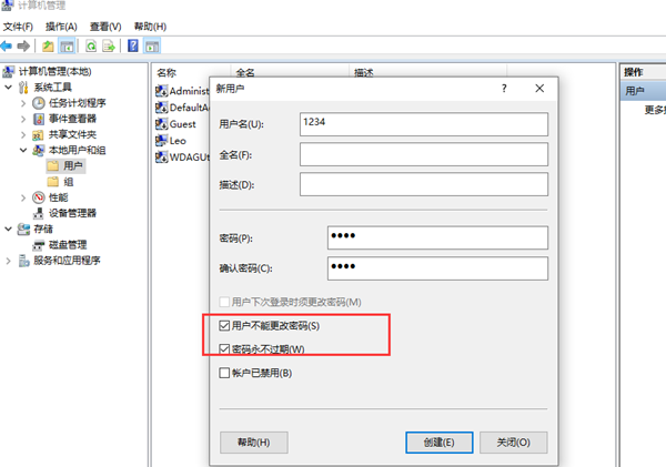 3、新用户窗口中,输入【用户名和密码】,【取消勾选】用户下次登录时须更改密码,同时【勾选】用户不能更改密码和密码永不过期。
