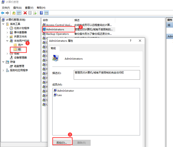 4、点击创建之后,新用户就创建成功了,但此时创建的账户是标准账户,没有管理员权限,接下来的操作是添加管理员权限。返回到计算机管理窗口,点击左侧【系统工具 - 本地用户和组 - 组】,然后双击右侧的【Adminstrators】,点击下方的【添加】。