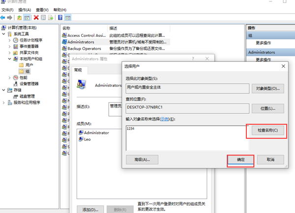 5、选择用户窗口中,输入之前【创建的账户名】,然后点击【检查名称】。【确定】后再点击【确定】即可。