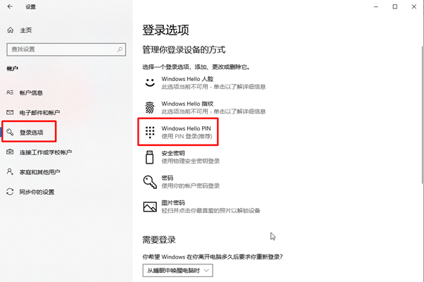 2、左侧点击登录选项,右侧选择PIN码,设置后就可以免回车登录啦。
