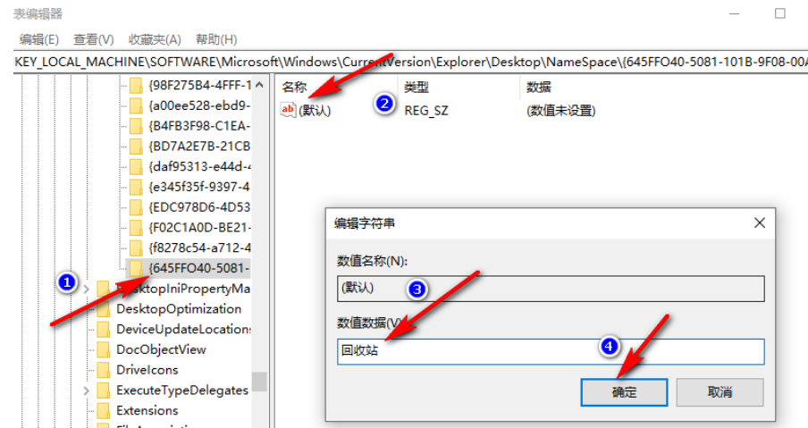 5、第五步,我们在“{645FFO40-5081-101B-9F08-00AA002F954E}”的右侧页面中双击打开“默认”值,然后在弹框中输入“回收站”,再点击确定选项即可。