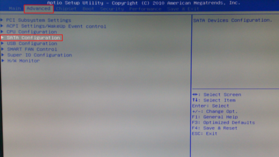 b、进入了BIOS设置之后,使用键盘上的↑↓←→来移动光标,选择“advanced”菜单用回车进入,然后找到SATA Configuration,按回车进入;
