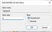 4、然后双击打开这个TaskbarSi值,将“value data”更改为“0”就可以使用小任务栏了。