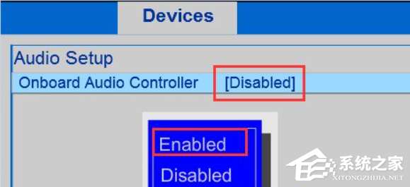 2、在“Audio Setup”上点击Enter按键,查看“Onboard Audio Controller”选项的状态,是否为“Disabled”,若是此状态,请在此选项敲击回车(Enter)按键,选择“Enabled”。