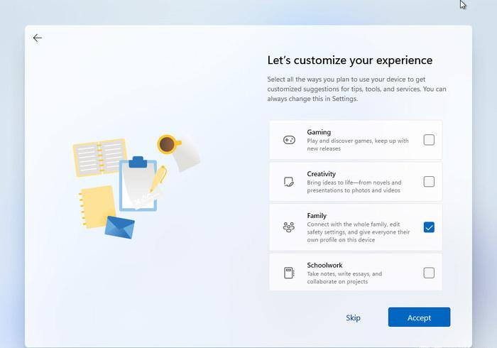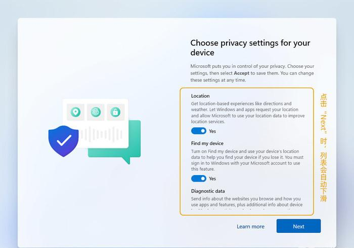 这里是权限设置面板,内容基本上和 Win10 一致。但一个小细节是,当你按下“Next”按钮时,Windows 11 会自动下滑列表,以保证用户看到全部的权限选项。而当内容显示完毕,“Next”按钮会变成“Accept”,这时我们才可以点击继续下一步。