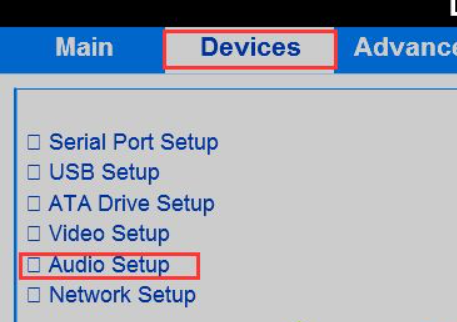 1、部分联想电脑可在Bios中禁用声卡,可以进入Bios,依次找到【Devices】【Audio Setup】。