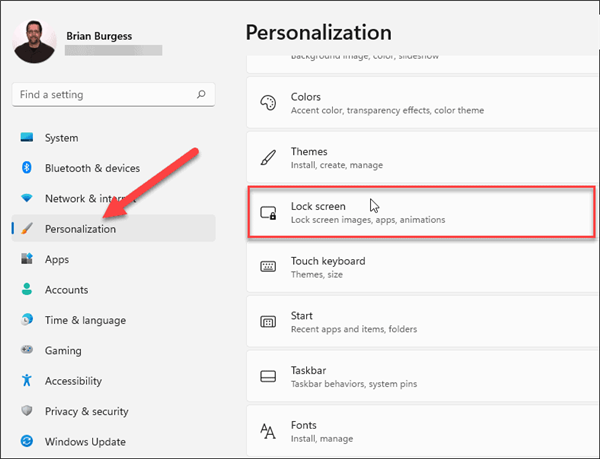 设置启动后,单击左侧列表中的个性化。然后,单击“个性化”部分下右侧菜单中的“锁定屏幕”按钮。