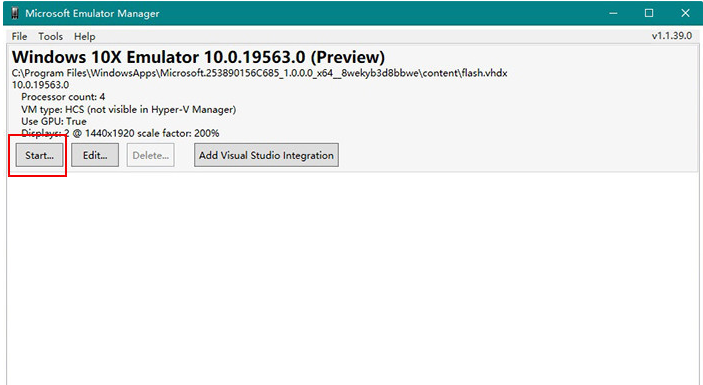 下载完成后,就能在开始菜单看到新装好的Microsoft Emulator了,打开后会弹出以下界面。这里会显示出当前电脑的硬件配置,以及自动加载好的Win10X镜像版本号,点击“Start”按钮即可启动Win10X。