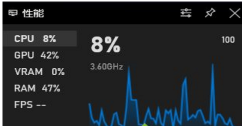 6、接下来,重新启动电脑。再次按下Win+G,将fps的性能模块拖拽到合适观看,点击右上角的锁定图标,将它固定;
