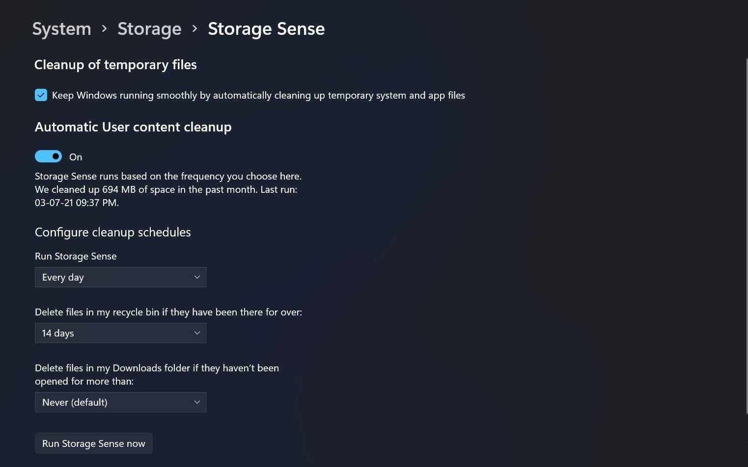 Windows 11 继承了 Windows 10 的存储感知功能。它旨在监控计算机的存储并在需要时通过删除不需要的文件(例如临时系统文件、回收站中的项目等)自动释放空间。