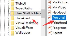 6、接着回到注册表编辑器,用同样的方法打开“user shell folders”下的“personal”文件。