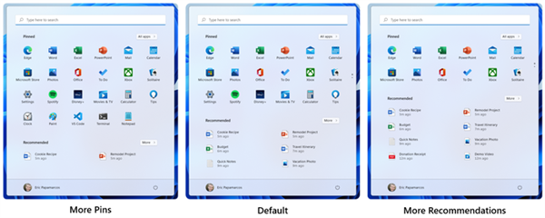根据用户的偏好,可以通过这两个选项来调整图标和推进内容的面积占比。顾名思义,第一个“更多固定图标”,可以让用户在开始菜单中固定更多的应用程序,而第二个选项则可以在开始菜单呈现更多的推荐内容。