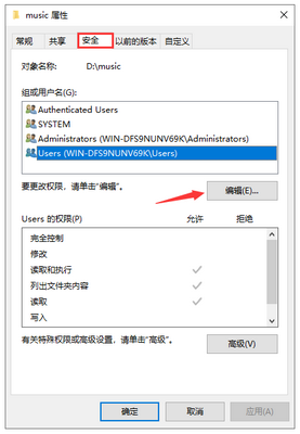 2、打开属性页面后,我们点击上方的安全,点击下面的编辑按钮