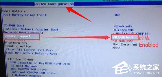 1、进入电脑BIOS,切换至系统配置(System Configuration)界面,修改Legacy Support为Enabled,也就是开启传统模式。然后在下方传统模式启动顺序(Legacy Boot Order)中调整U盘启动为第一项,保存修改,并重新启动。(不同品牌电脑进入BIOS方法不同:联想电脑开机按F12或F2,惠普电脑开机按F10)