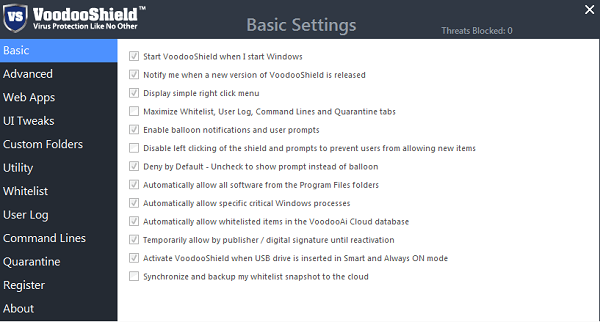 一旦防病毒程序创建了系统的白名单快照,VoodooShield便可以阻止计算机的功能,从而不允许其运行任何其他软件。换句话说,您可以创建允许程序的列表,并将计算机设置为仅运行指定的软件。但是,您可以选择允许其他程序通过保护墙。