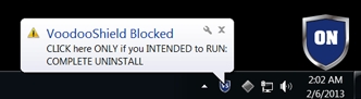 如果VoodooShield阻止了您要运行的软件,只需单击桌面上的盾牌小工具或气球通知即可扫描并运行该软件。您也可以在桌面屏蔽小工具上单击鼠标左键以切换到“关闭”模式以允许其他软件。您也可以右键单击VoodooShield以获得更多选项和设置。