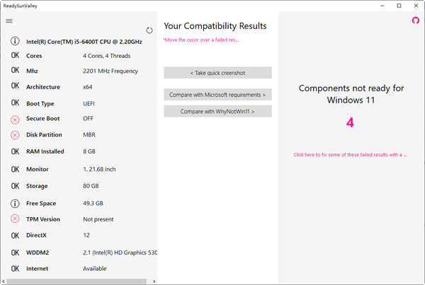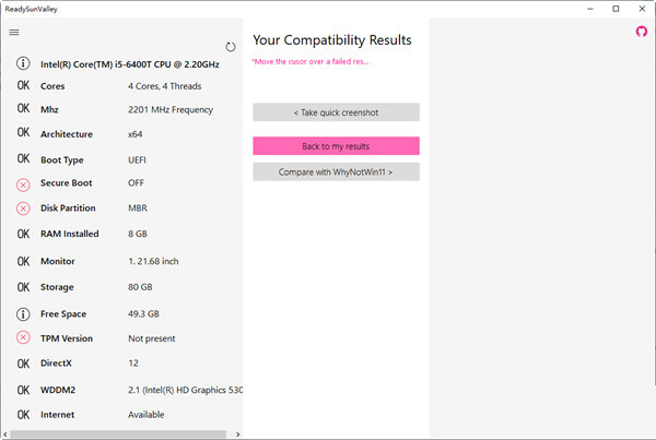 2、将结果与另一个兼容性检查器WhyNotWin11 进行比较,将您的结果与 Microsoft 要求进行比较,抓取屏幕截图以直接在社交媒体上分享您的结果。