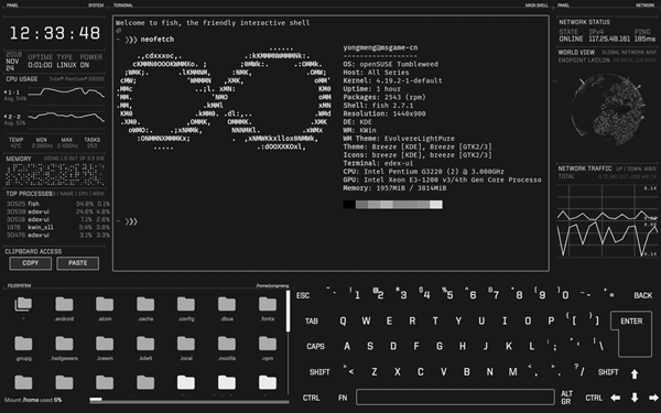 实时系统(CPU,RAM,交换,进程)和网络(GeoIP,活动连接,传输速率)监控。