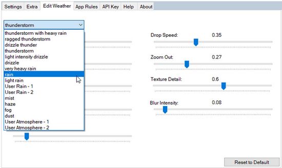 自定义天气桌面效果不受实际天气影响在设置里的Edit Weather选项卡下,可以编辑大部分天气效果显示的强烈程度等参数。