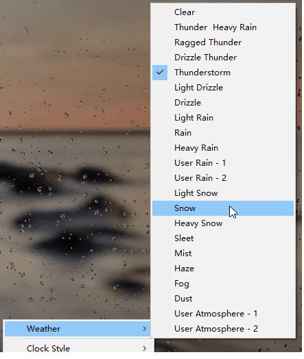 指定颜色如果不需要它显示天气,只想要天气桌面效果的话,完全可以在设置里关闭显示天气UI。勾选“Enable Weather Selector”后,就能够通过托盘右键菜单任意切换效果。