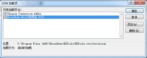 第一次安装中,如果未能出现【易用宝】选项卡,可以依次单击【文件】→【选项】→【加载项】→【COM加载项】,单击“转到”,打开【COM加载项】对话框,勾选【ExcelHome Excel 易用宝2018】选项,单击【确定】按钮。