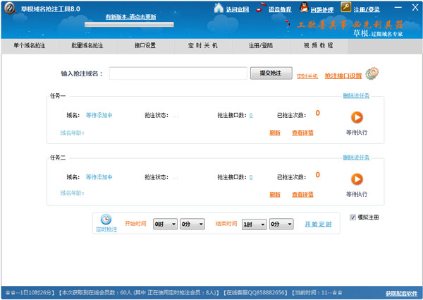 目前版本在旧版本单一查询的基础上握手阿里云新添(云通道),使用的会员越多抢注速度越快。软件100%完美处理大频率提交,注册商封接口问题。