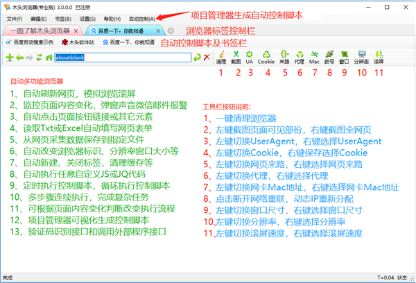 11、标签控制:支持自动打开、切换、关闭浏览器标签页,浏览器自动前进后退功能;