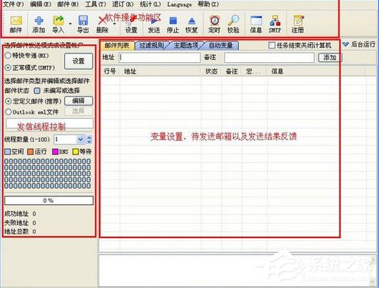 4、【变量设置、待发送邮箱、发送结果反馈】这个位置一般都是导入收件人、看发送进程和反馈结果的地方;