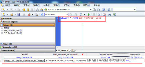 然后我们来写一个简单的数据库SQL语句,查询一条记录SELECT*FROM PMP_Contract_DSet,便可以在下方查询到对应的数据信息。