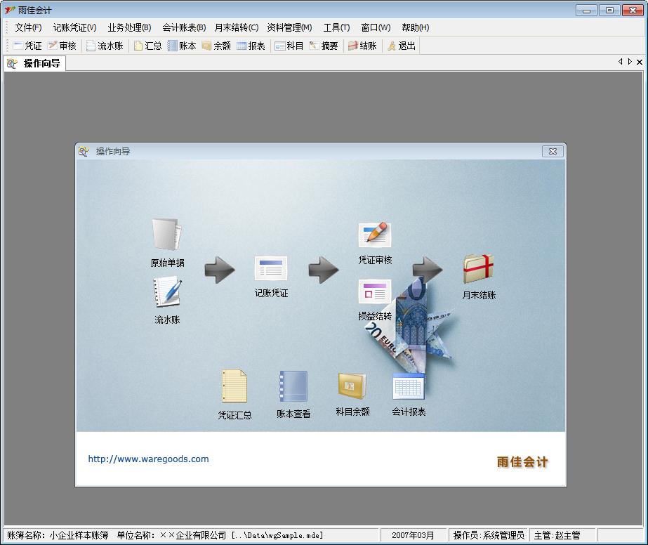 雨佳会计是一款会计核算处理的会计软件,内置了凭证、记账凭证、业务处理、会计账表、月末结转、资料管理、辅助工具等主要功能模块,软件用户可以对会计所做的账表进行审核,可以自动计算出周期时间内的流水账明细以及回汇总和账本,可以对会计所做的账表进行科目分类,用户可以自定义编辑账表摘要。