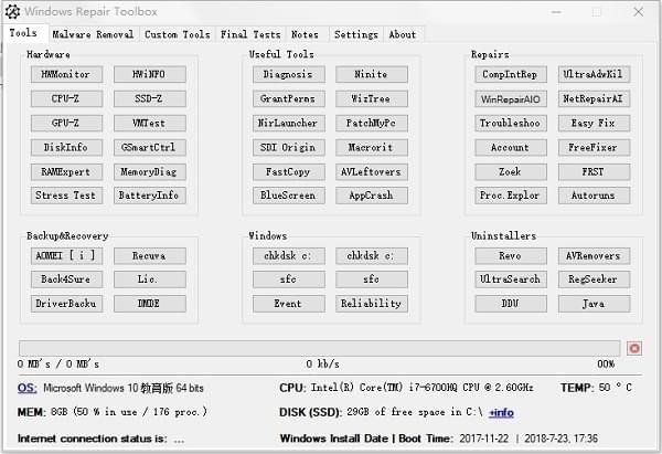 Windows Repair Toolbox是一款十分强大的Windows修复工具,软件可以帮助用户快速的针对Windows系统出现的各种问题进行修复。同时软件还可以为用户检测电脑硬件的相关信息,报过了显卡、内存、CPU等,有需要的小伙伴快来下载吧!
