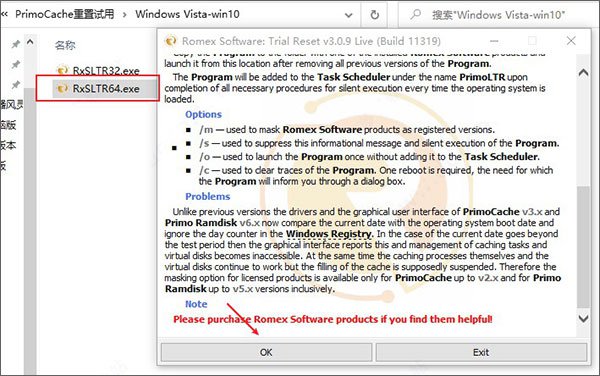 5、然后再primocache包中运行与电脑系统版本与位数对应的重置补丁,如这里小编运行的是win10 64位;