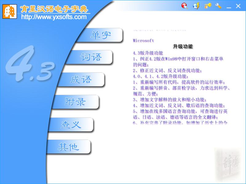 育星汉语电子字典具有拼音、部首查询功能,数据参照最新版的新华字典,方法同新华字典的拼音、部首查字法,且比手动翻字典更方便、更迅速。
