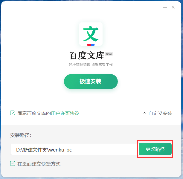 3、点击“自定义安装”进入自定义安装界面,软件默认安装位置为“C:/Program Files (x86)/wenku-pc”,点击“更改路径”可以选择其他磁盘安装。