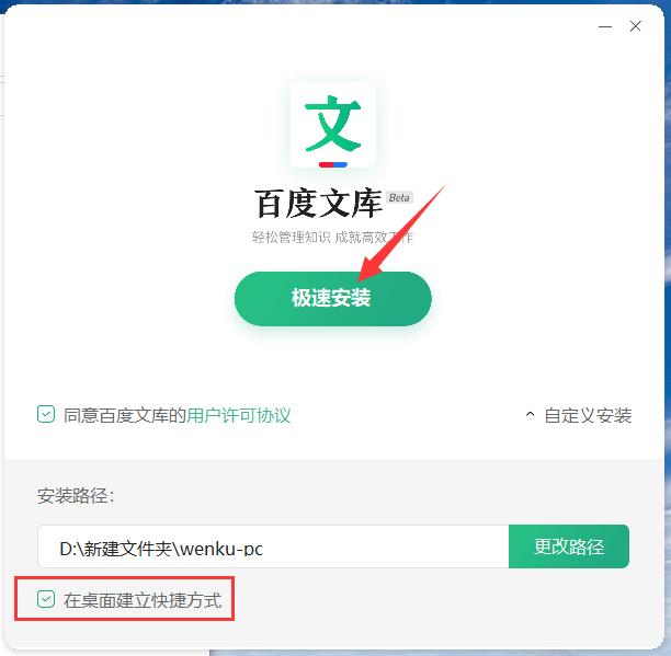 4、根据需要选择是否在桌面建立快捷方式,然后点击“极速安装”即可。
